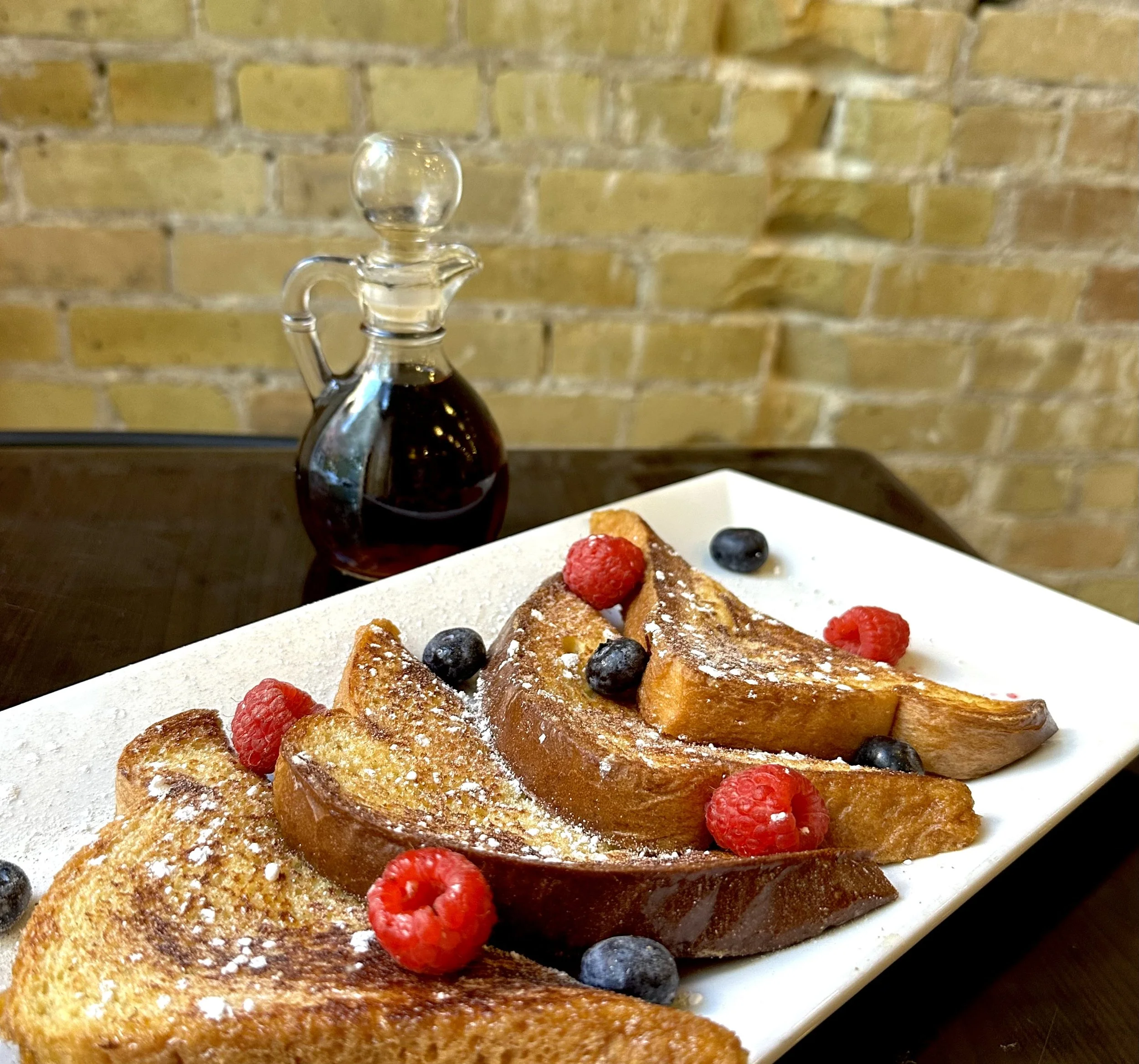 Crispy challah French toast dusted with cinnamon sugar and powdered sugar, served with a side of maple syrup.