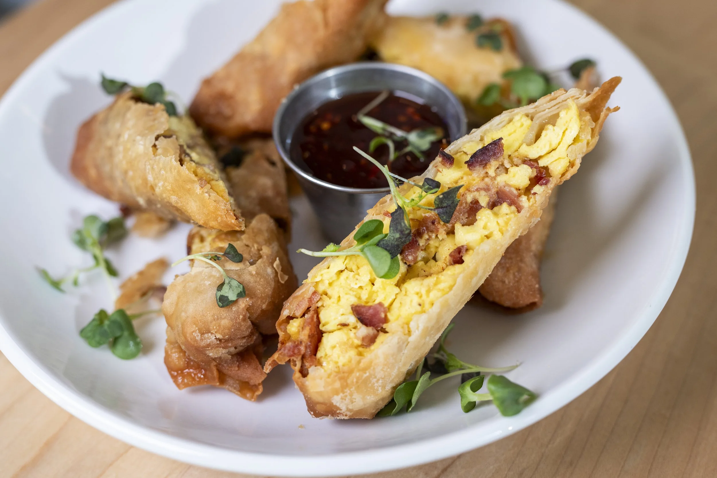 Bacon, egg, and cheese in a crispy egg roll wrapper, served with a side of maple chili sauce.