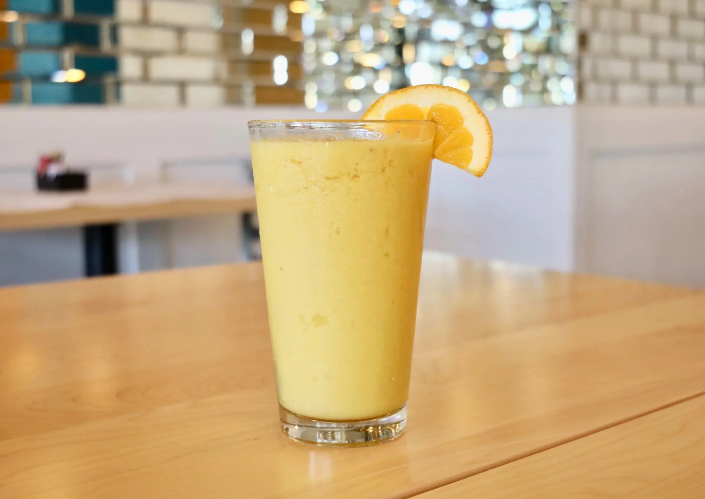 Pineapple, mango, banana, carrot, coconut milk, lemon wheatgrass, spinach, and sacha inchi protein.