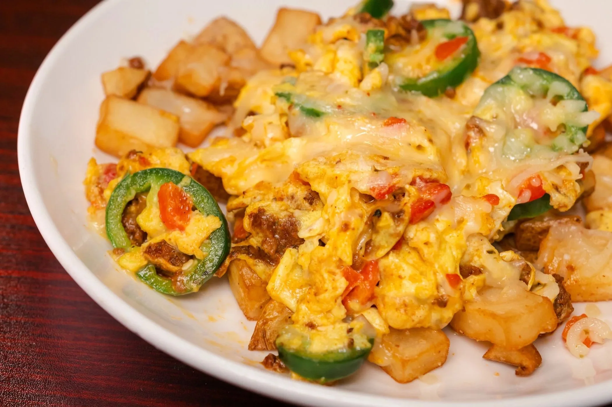 House chorizo with sautéed onions, roasted red peppers, jalapeños and pepper jack cheese.