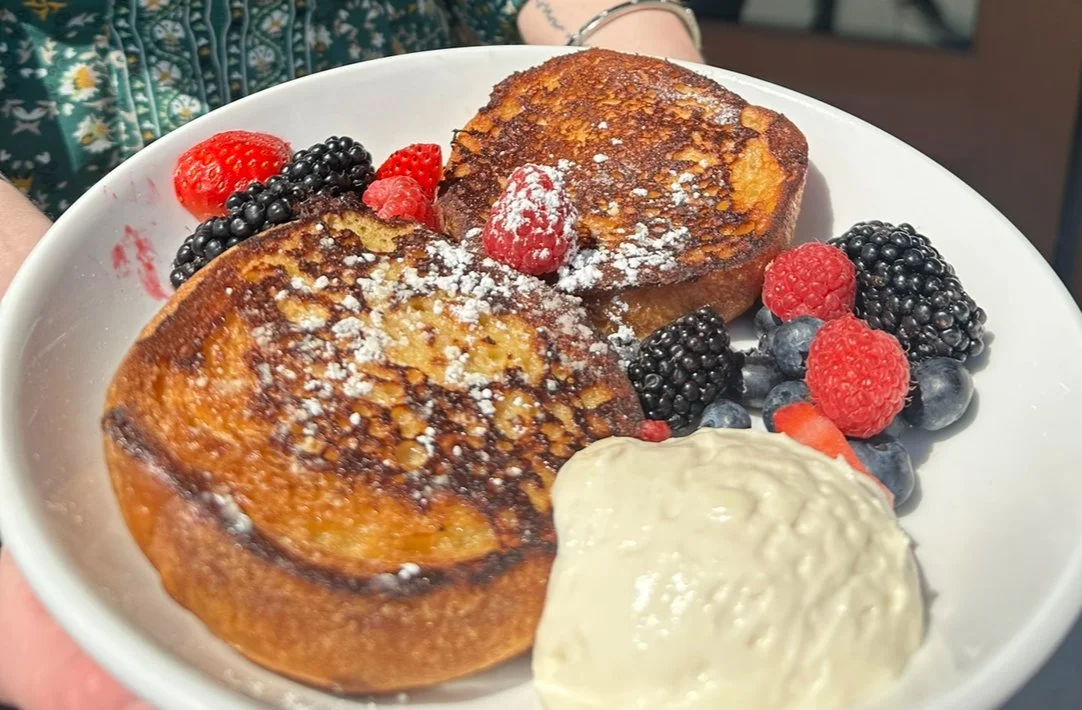 Buttery croissant dipped in French toast batter, sprinkled with maple cinnamon sugar and powdered sugar, served with fresh berries and sweet ricotta.