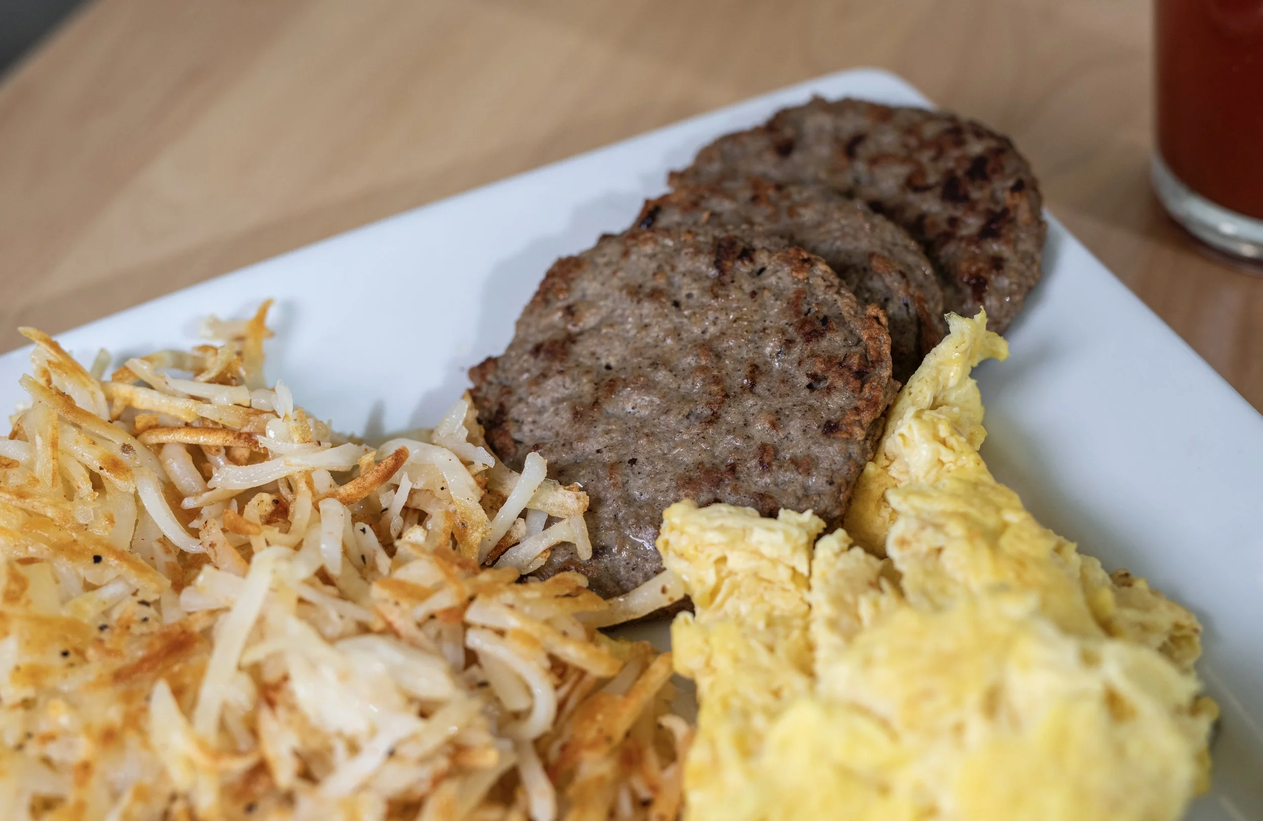 Bacon crumbles, sausage links, tomatoes, onions and cheddar cheese.