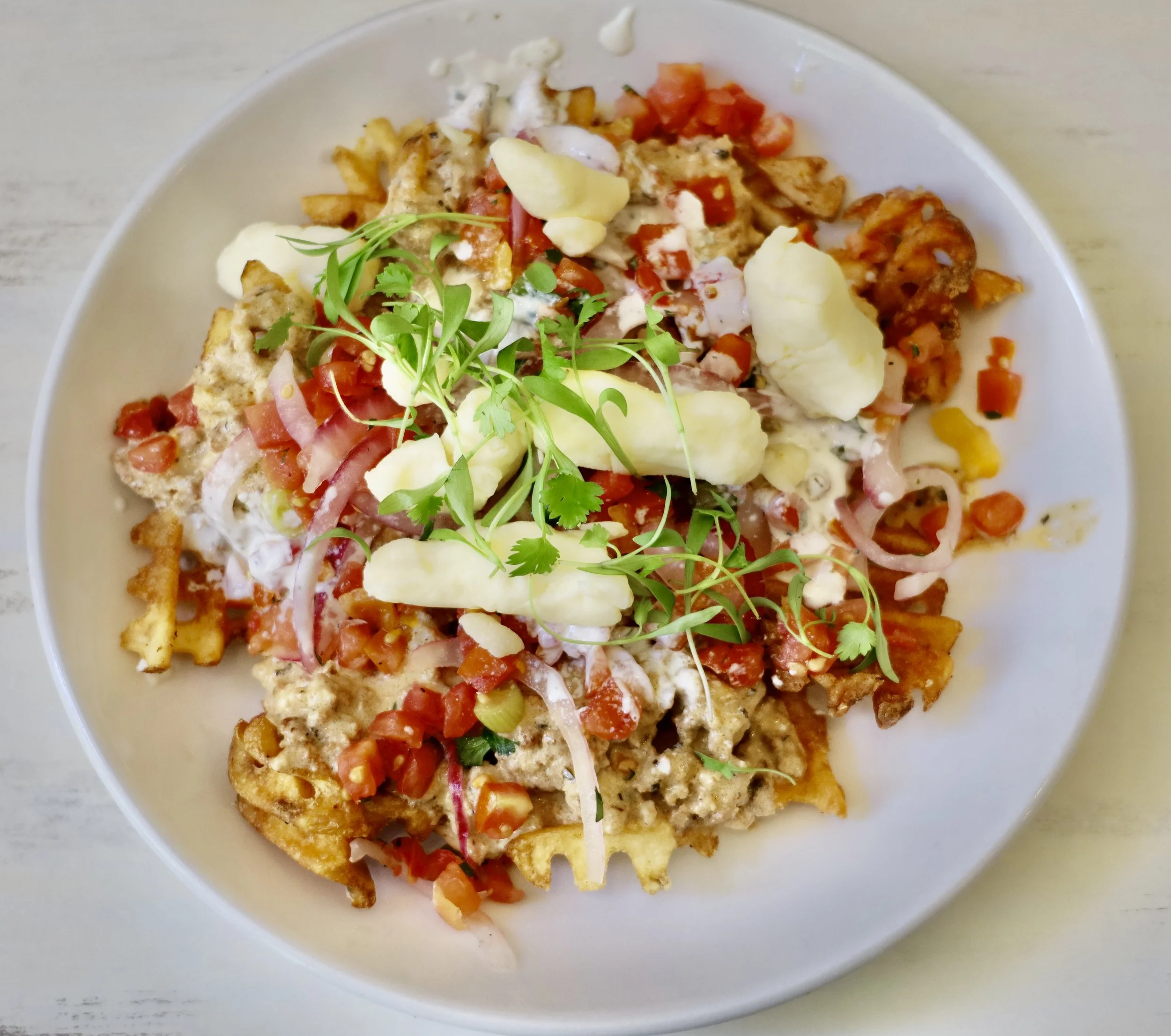 Waffle fries loaded with house chorizo gravy, pico de gallo, Wisconsin cheese curds, cilantro, and avocado ranch.