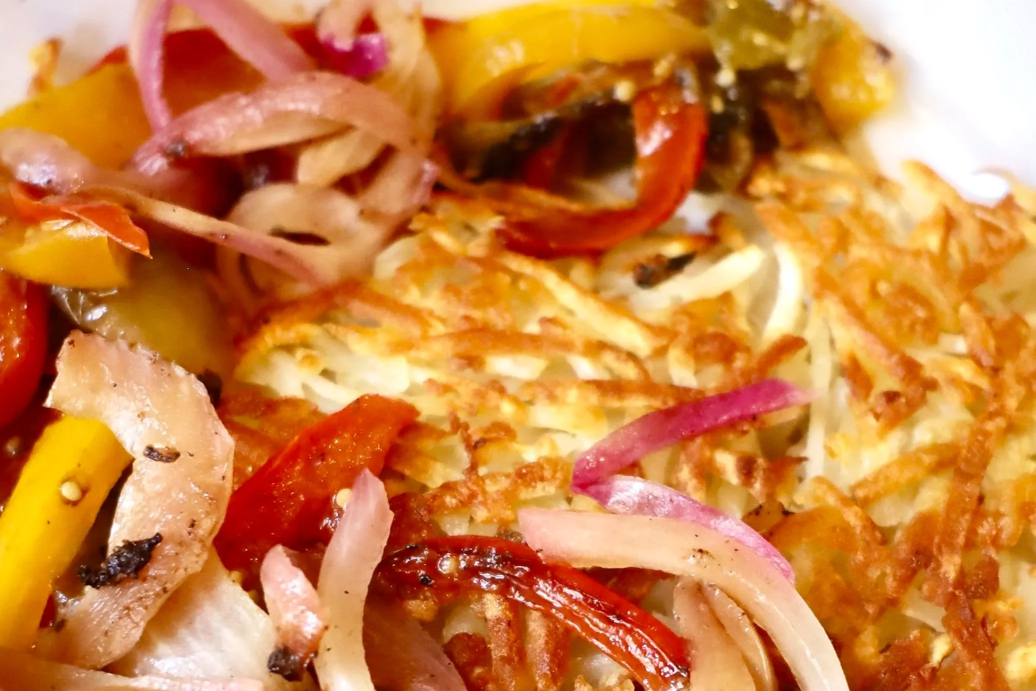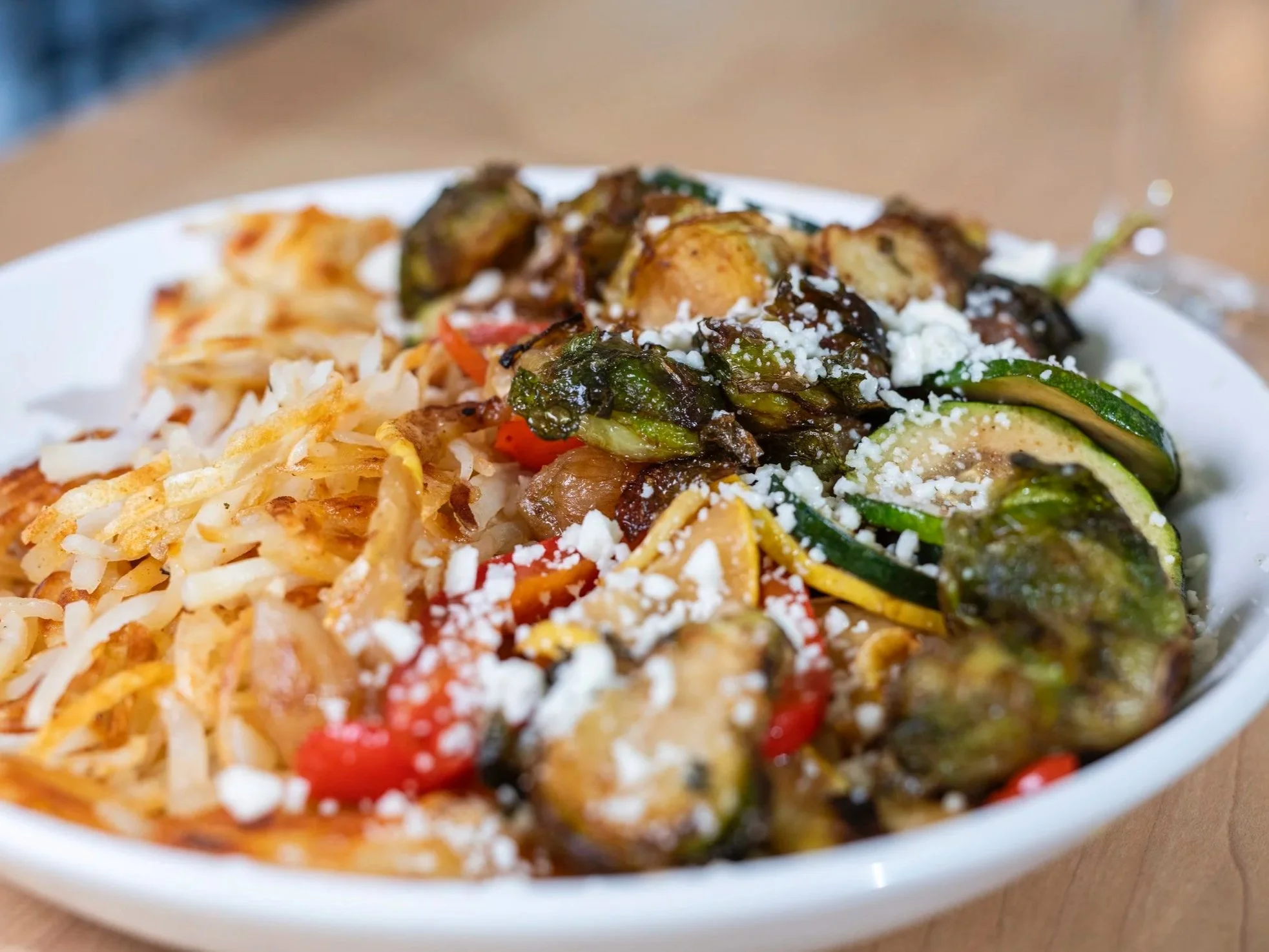 Crispy hash browns topped with a seasonal vegetable blend and two eggs your way.