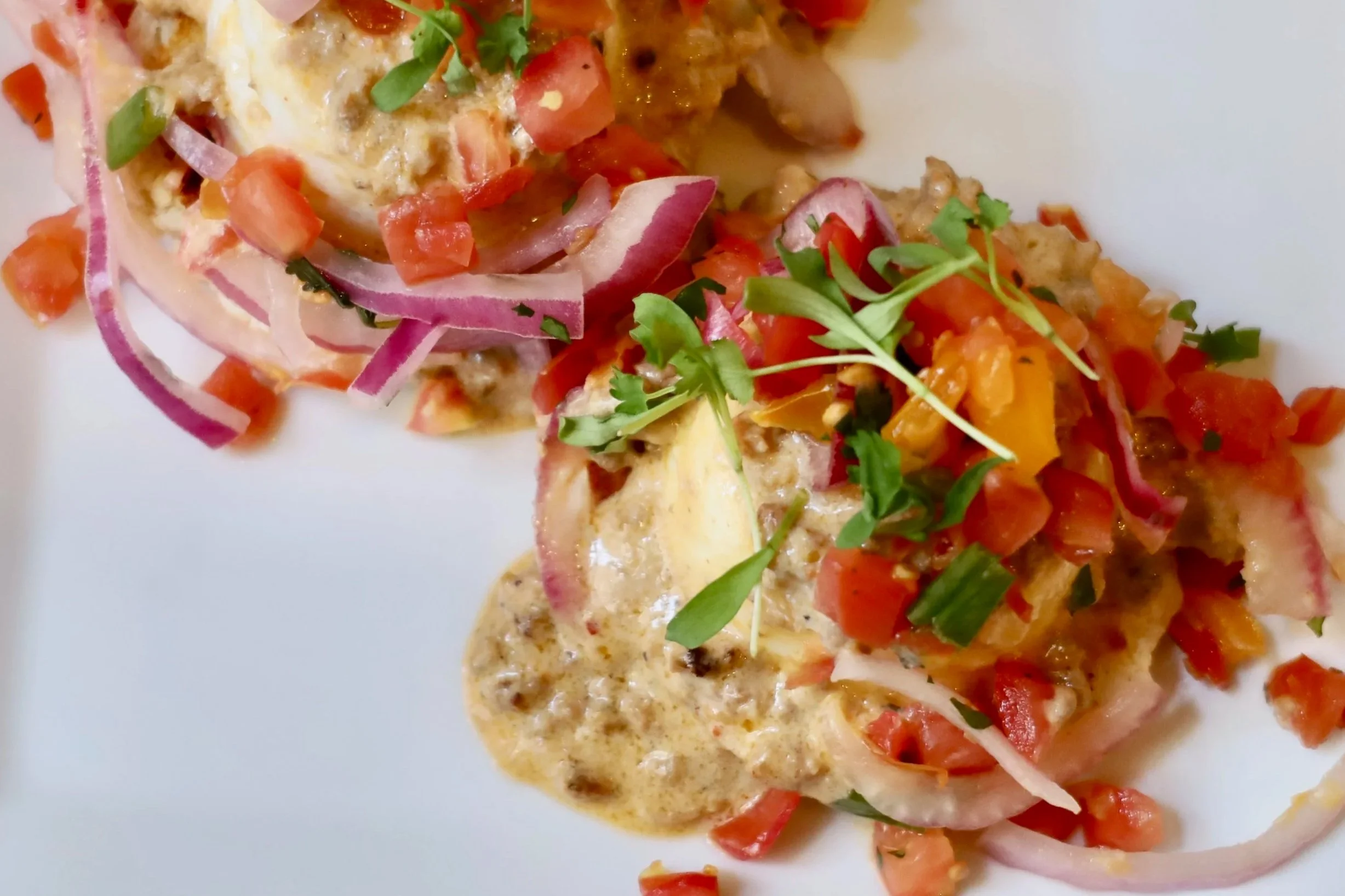 Buttery biscuits smothered in house-made chorizo gravy, topped with fresh pico de gallo and cilantro. Served with your choice of side.