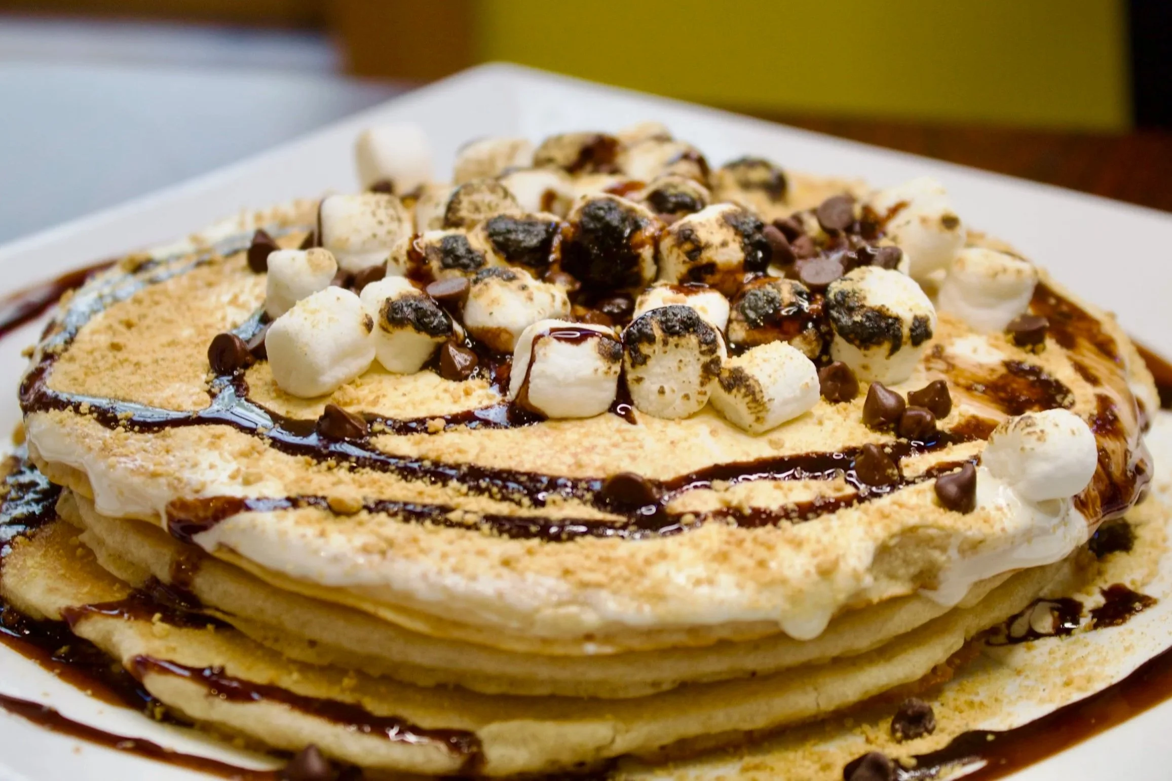 Buttermilk pancakes topped with chocolate chips, roasted marshmallow fluff, chocolate sauce and graham cracker pieces.