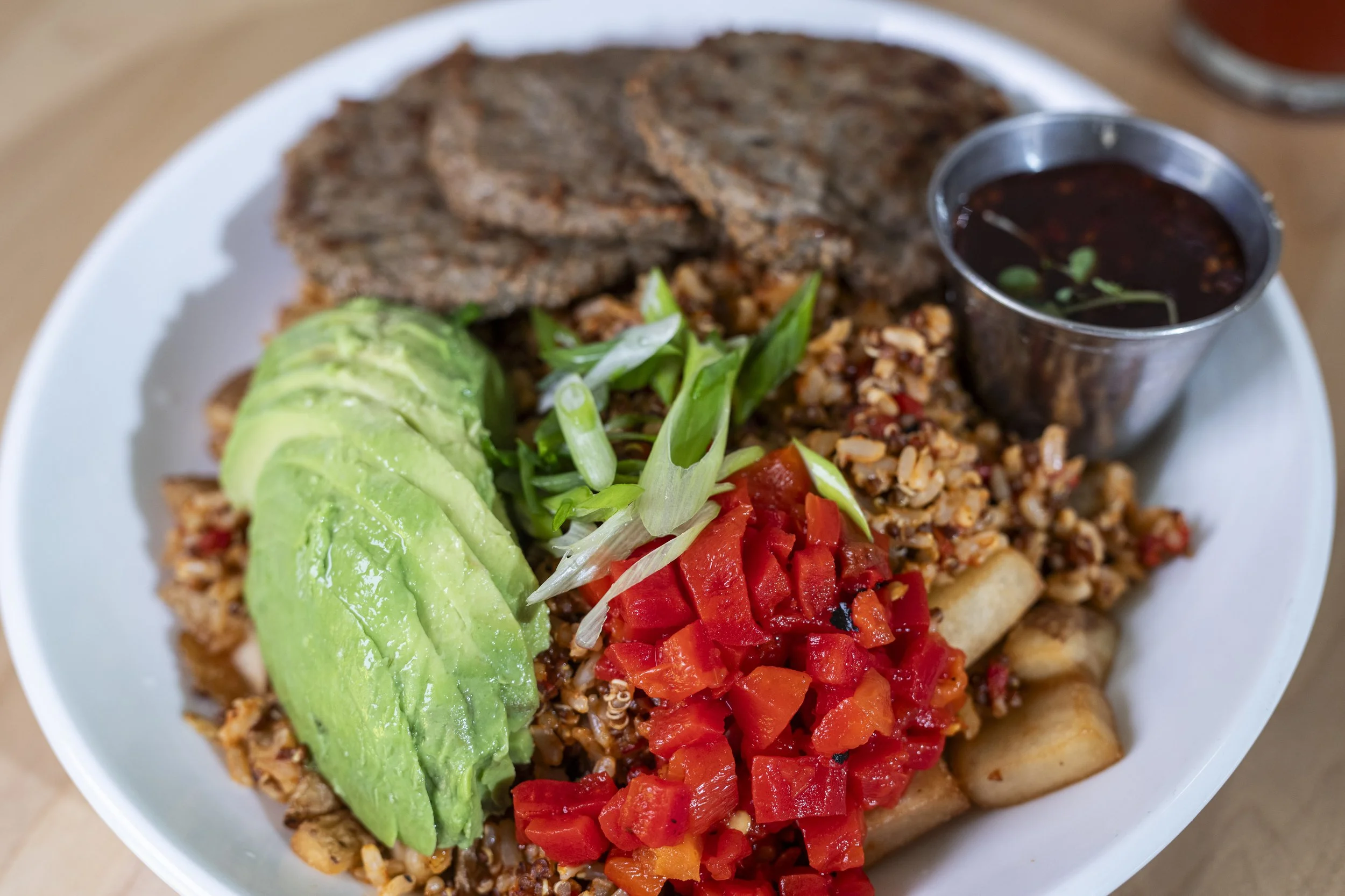 BBQ and Berbere-seasoned brown rice and quinoa on breakfast potatoes, topped with roasted red peppers, mushrooms, turkey sausage, fresh avocado, and two eggs your way.