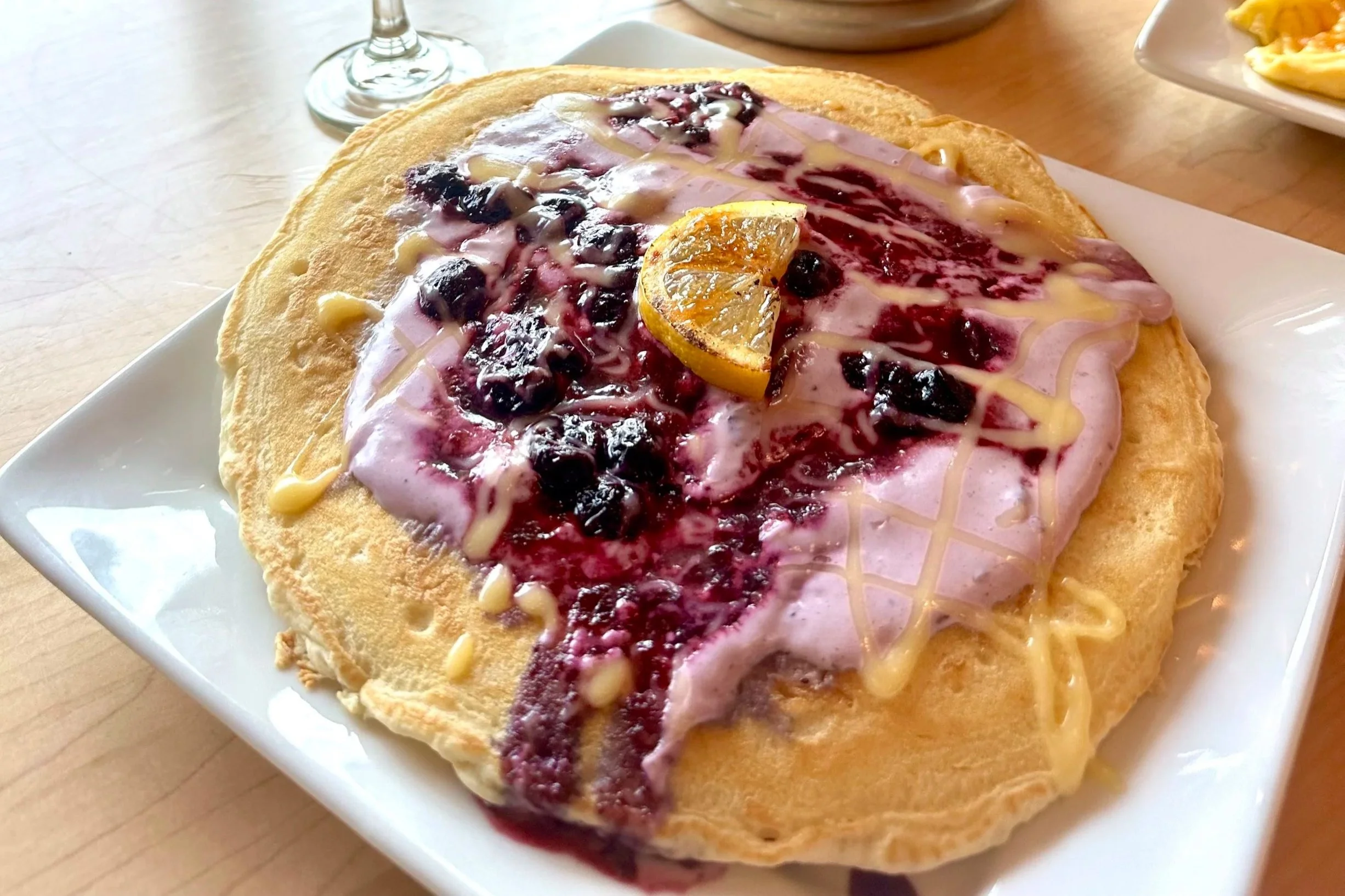Buttermilk pancakes topped with blueberries, blueberry compote, lemon curd, and blueberry cream cheese.